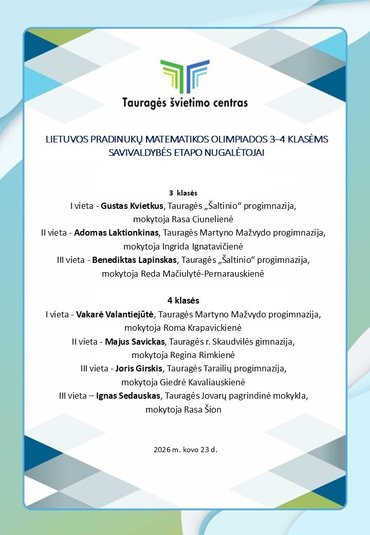 Sveikiname mokinius ir jų mokytojas!